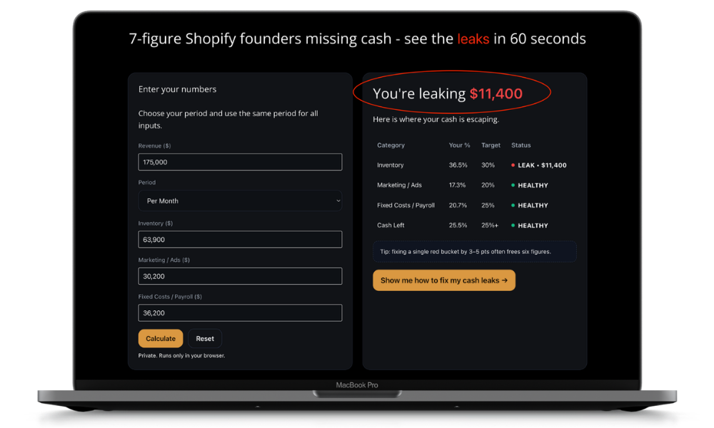 This is for 7-figure Shopify founders with strong sales but inconsistent cash. If revenue is coming in and cash isn’t building, there’s a leak. That’s not a mindset issue. It’s structural. This calculator shows you where to look first.